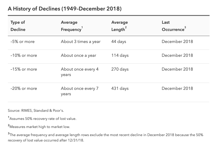 At times like these, it’s important to put current conditions into perspective. This is not the first time the market has taken a tumble and it won’t be the last. Declines in the Dow Jones Industrial Average are actually fairly regular events. In fact, drops of 10% or more happen about once a year on average.